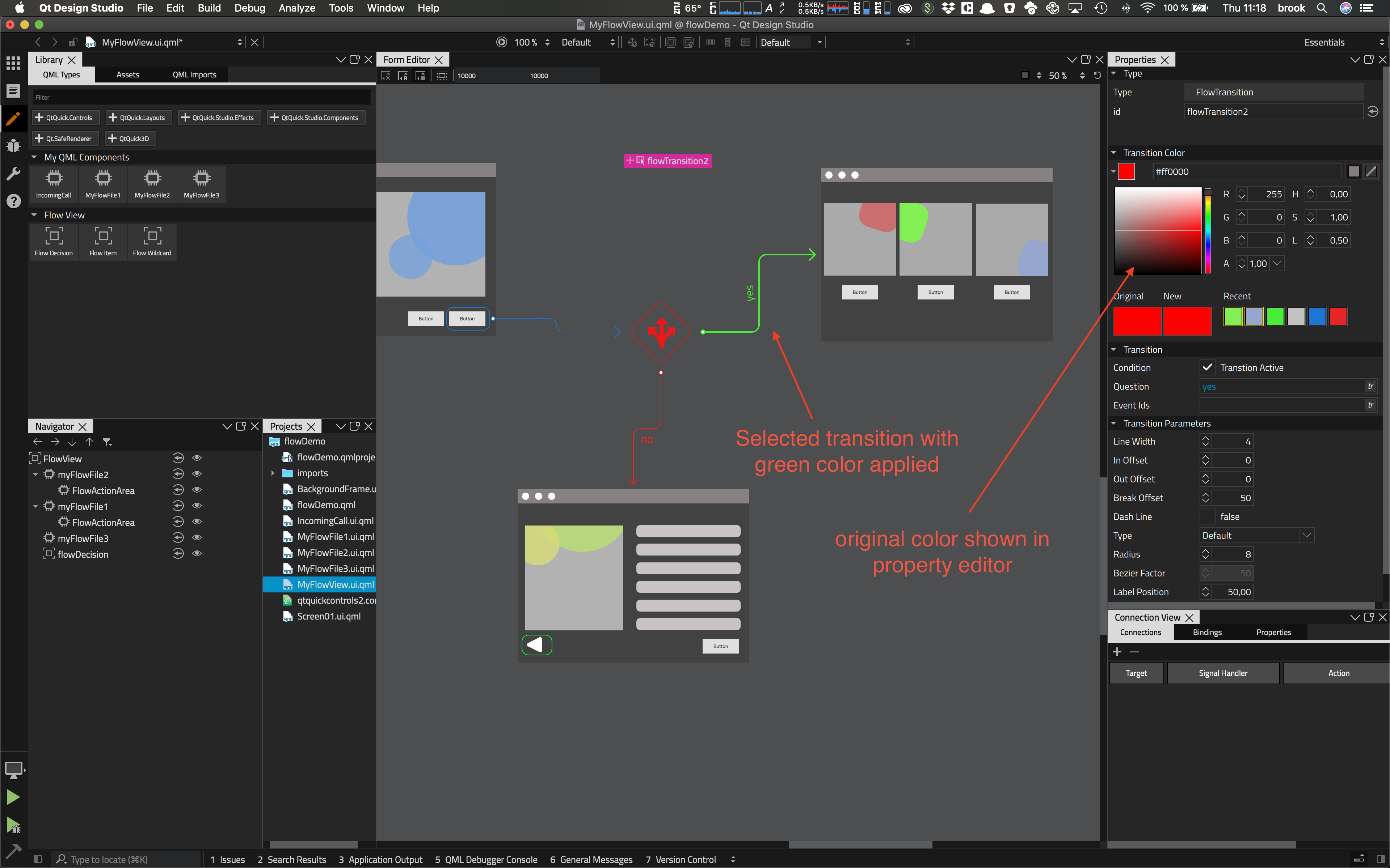 When changing a color of a transition, clicking away and re-selecting the new color is not shown in the property editor, instead the old color is there.