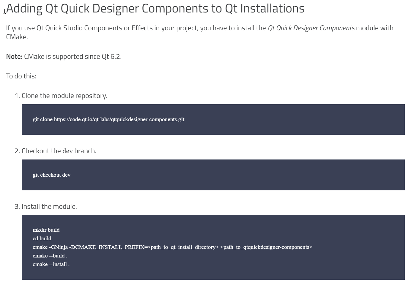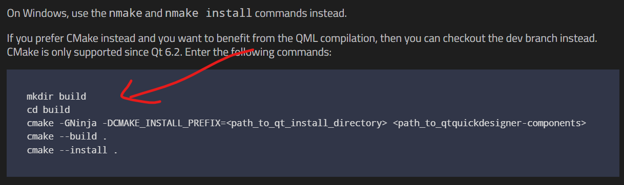 In the second line, it says "cd build," so I moved to build directory and executed the line three, "cmake -GNinja -DCMAKE_INSTALL_PREFIX=<path_to_qt_install_directory> <path_to_qtquickdesigner-components>."