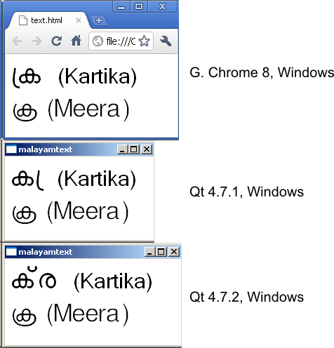 A problematic Malayalam string is UTF-16 sequence 3349 3405 3376, aka. 0x0D15, 0x0D4D, 0x0D30. Qt renders it correctly with Meera but incorrectly with JanaMalayalam and Kartika.