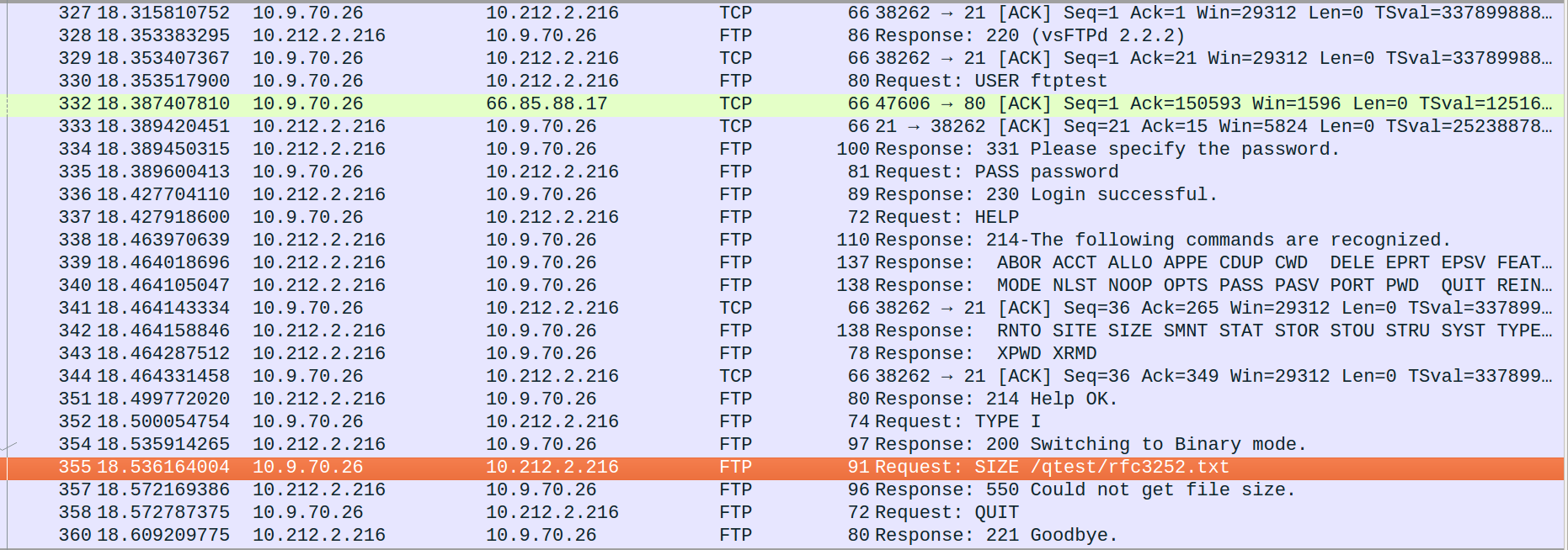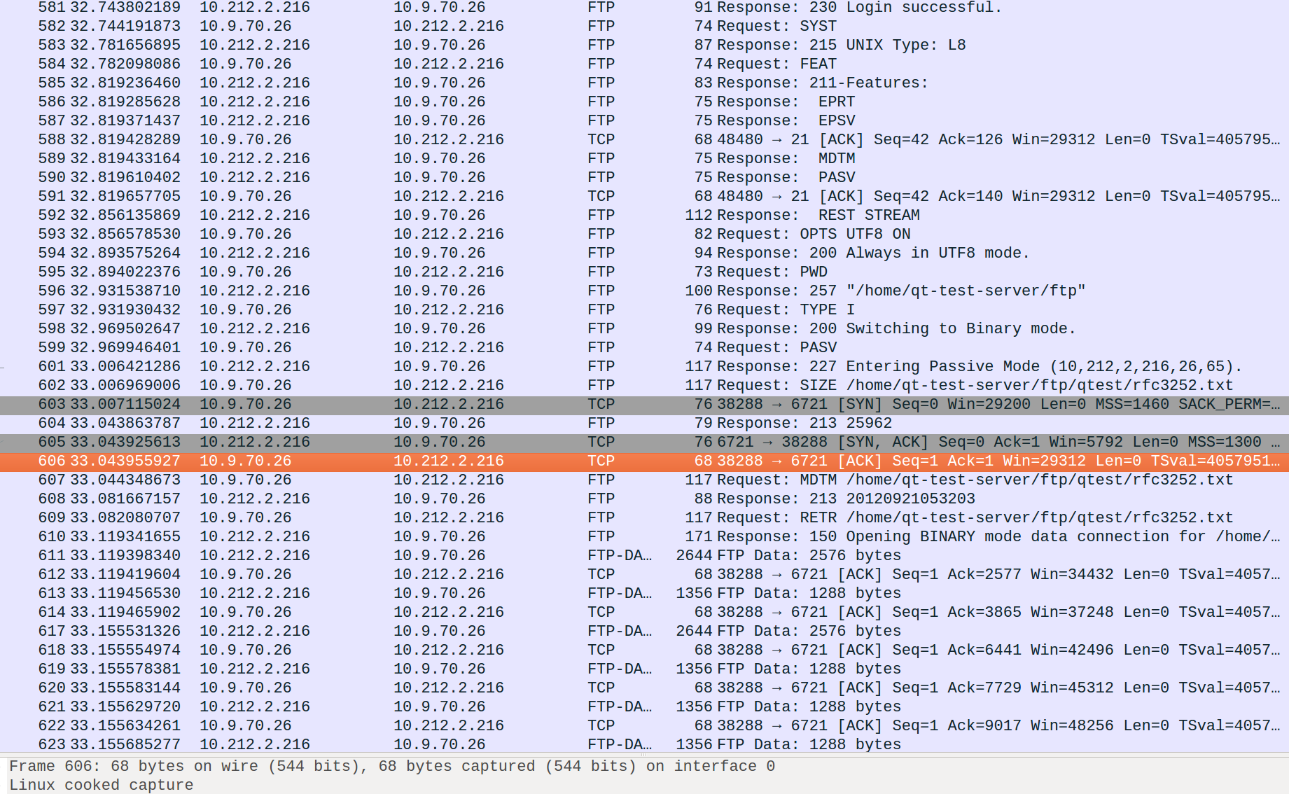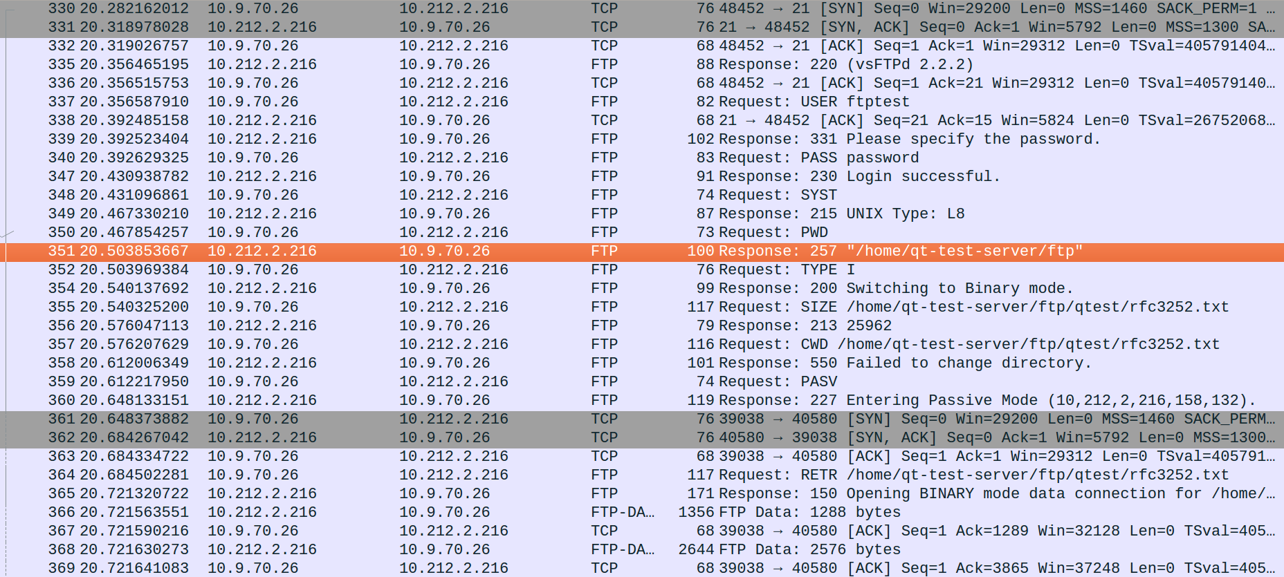 The reason is that we issue the command "CWD /qtest" which is incorrect.