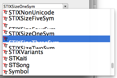 Add a QFontComboBox to a widget and scroll to the Stix font family (this is supplied with the OS).