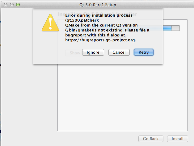 The problem seems to be the path the installer is looking into "/bin/" instead of the full "/Users/qa/Qt5.0.0-rc1/5.0.0-rc1/clang_64/bin"