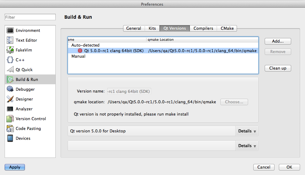 qmake can be found in /Users/qa/Qt5.0.0-rc1/5.0.0-rc1/clang_64/bin though