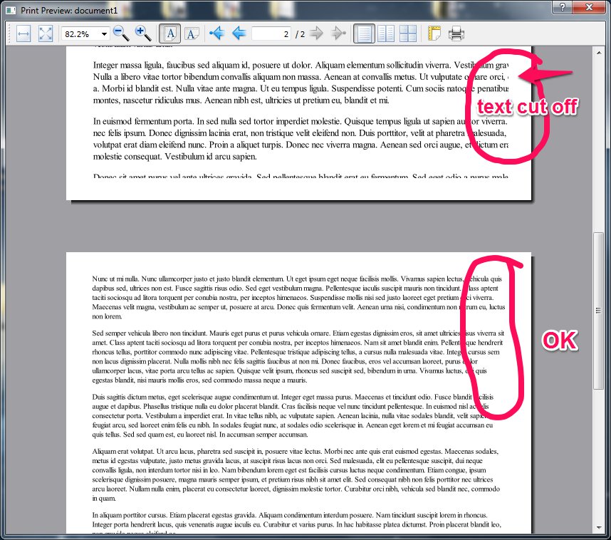 The text is cut off at the right margin when print html page from QWebView. This seems occurred only on first page, the following pages are printed ok.
