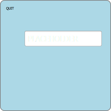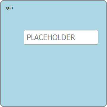 import QtQuick 2.0 import QtQuick.Controls 1.0 Rectangle { width: 360 height: 360 color: "lightblue" border.color: "grey" border.width: 2 radius: 15 Text { x: 20; y: 20; width: 60; height: 30; text: "QUIT" MouseArea { anchors.fill: parent onClicked: { Qt.quit(); } cursorShape: Qt.PointingHandCursor } } TextField { placeholderText: "PLACEHOLDER" x: 80; y: 100; width: 250; height: 50; font.pixelSize: 25 } }