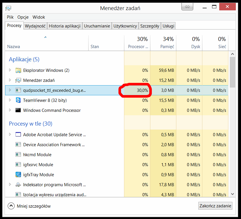 8. Now set low value of TTL eg. 3 to generate ICMP 'TTL Exceeded' message, and click Test - CPU usage will raise, and will be high until app is closed.