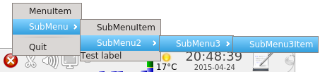 Context menu on QSystemTrayIcon (DBusTray) doesn't handle submenus, when it is added after QSystemTrayIcon::setContextMenu(). This bug is related to "QTBUG-45191".