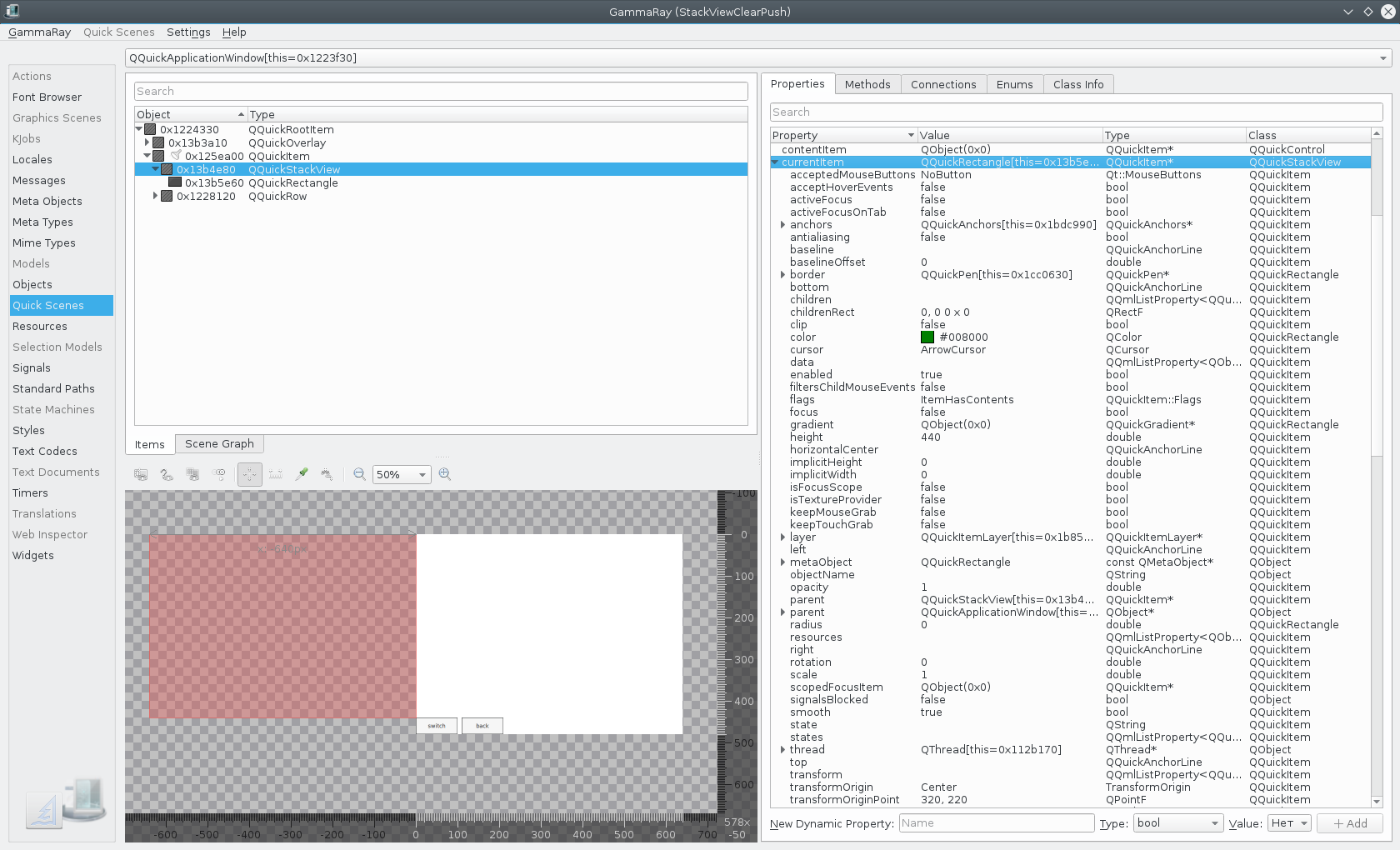 The item is visible, has proper parent and dimensions. It is also currentItem of the stack, but after clear() it has wrong x coordinate which doesn't change after push.