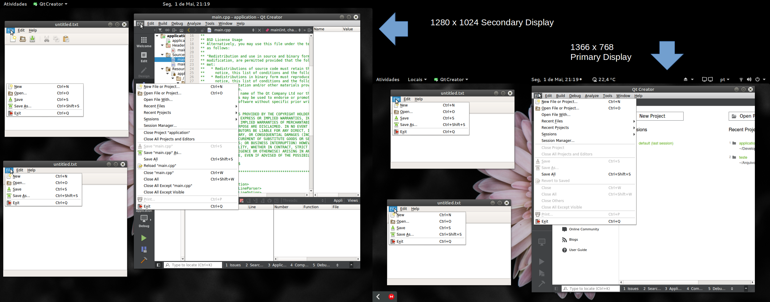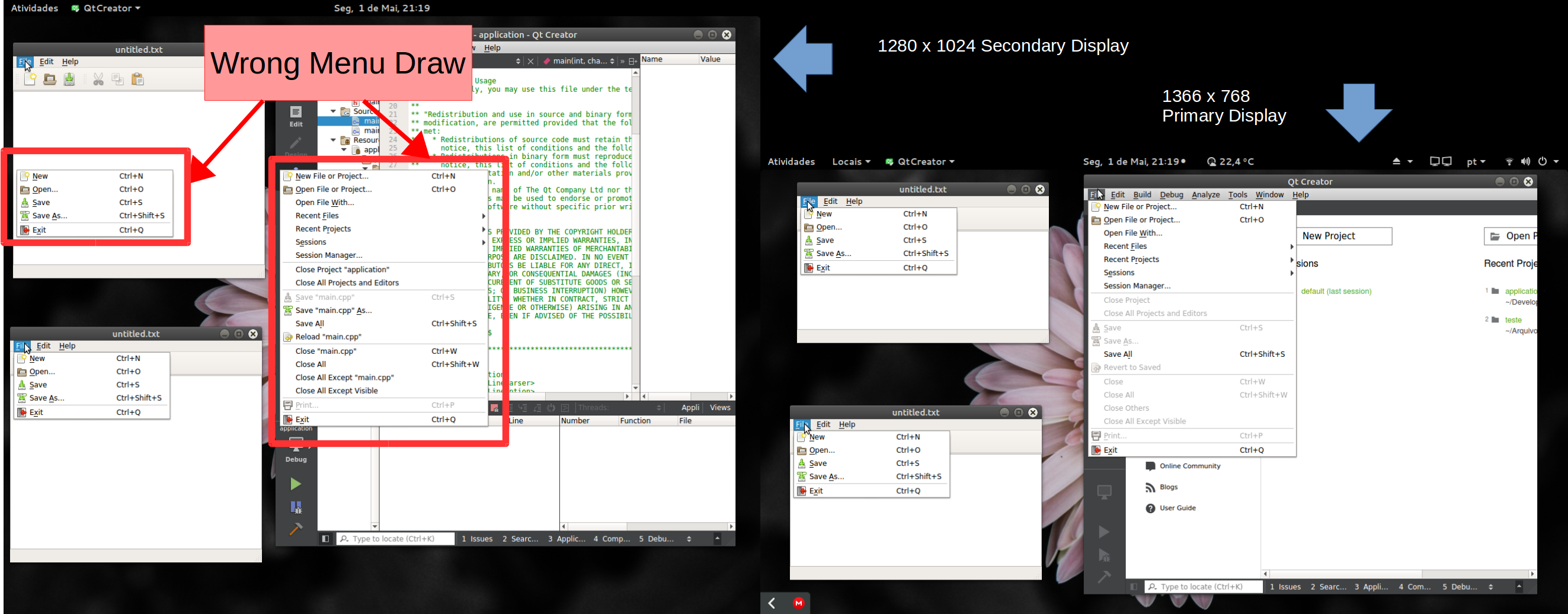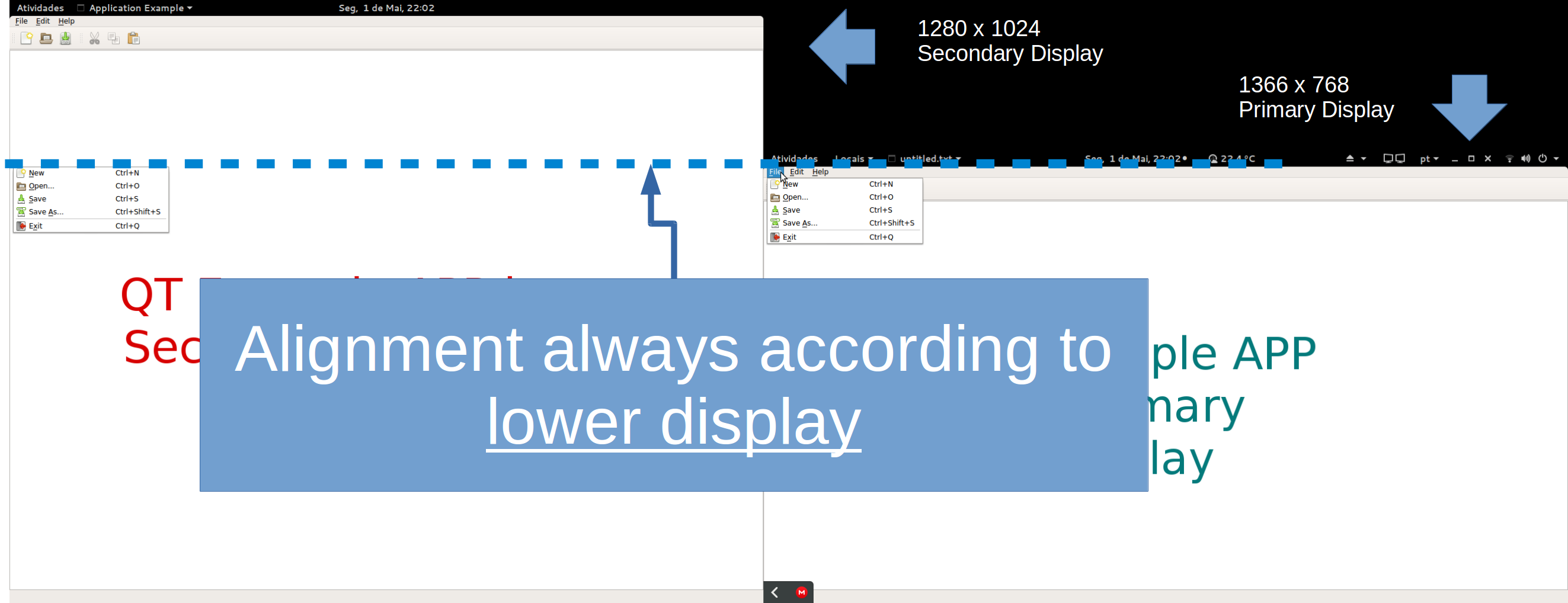 This bug affects any application that uses QT in the system like QT Creator, Kdenlive, Krita and even QT Examples, since the window of this QT application is on a monitor with a higher height, as can be seen in the attachments.