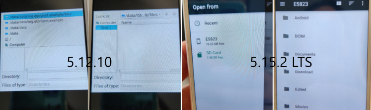 On Android 6.0 or above QFileDialog only shows only inside app folder even if runtime permission is granted.(I used patch in QTBUG-50759)