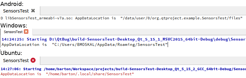Adding the line "QT += sensors" in .pro file and compiling for Android causes a "WARNING: QApplication was not created in the main() thread." at program startup. This leads into a wrong application directory: QStandardPaths::writableLocation(QStandardPaths::AppDataLocation) returns "/" only.