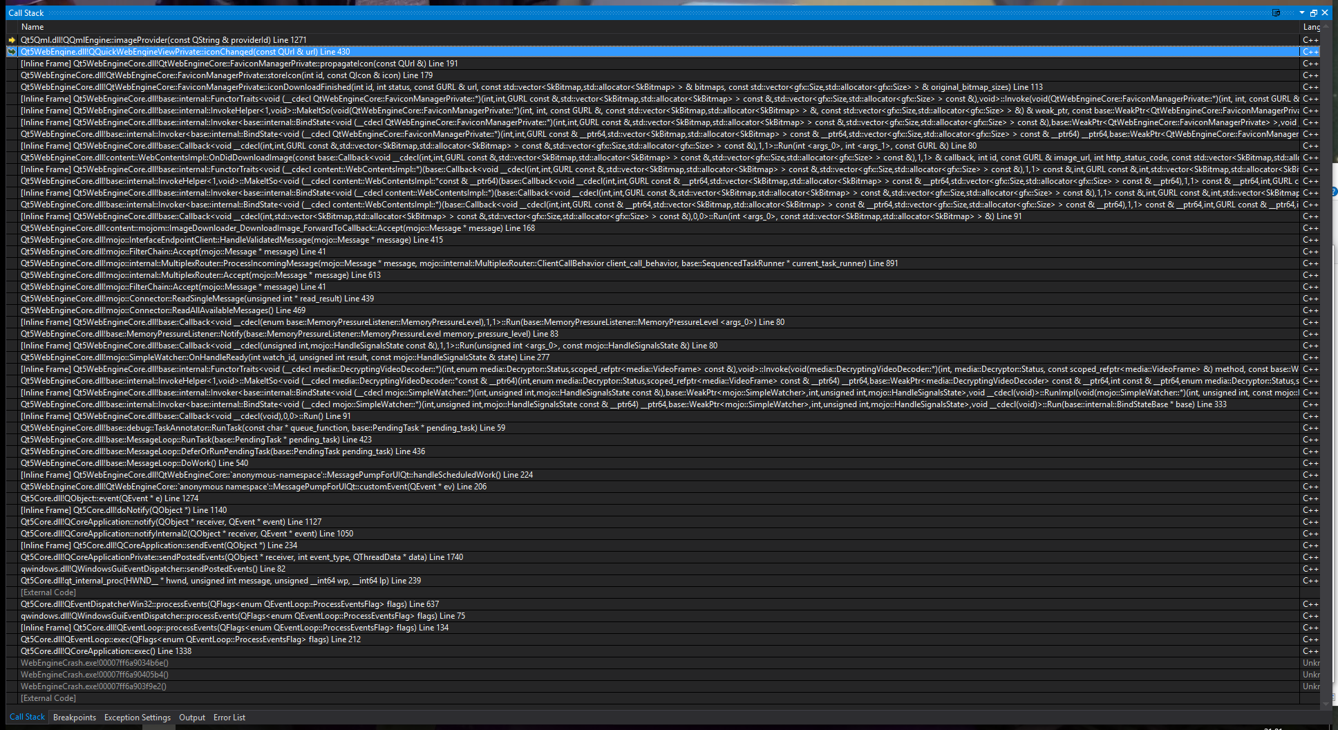 I'm seeing intermittent crashes from deep inside the QQuickWebEngineView class when destroying web surfaces.  The crash seems to be related to website favicon management, and is inside `QQuickWebEngineViewPrivate::iconChanged` in this code block: