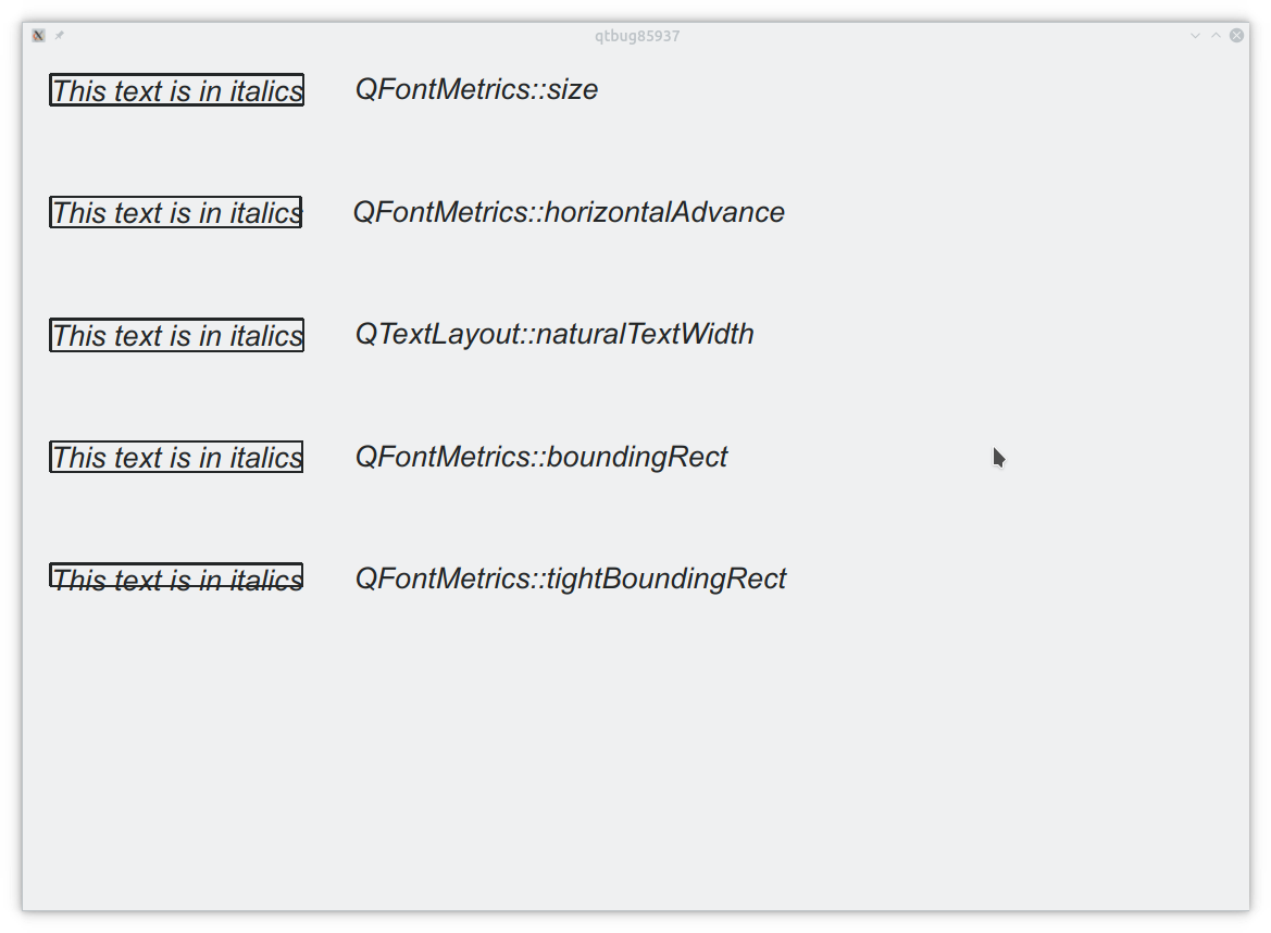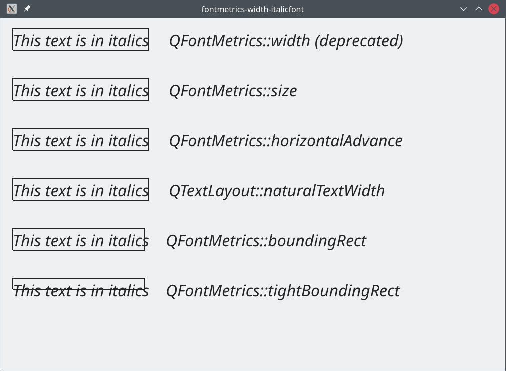 In the second screen shot, the bounding rectangle returned by QFontMetrics is enlarged by 2 pixels in width, and drawText() now renders the string