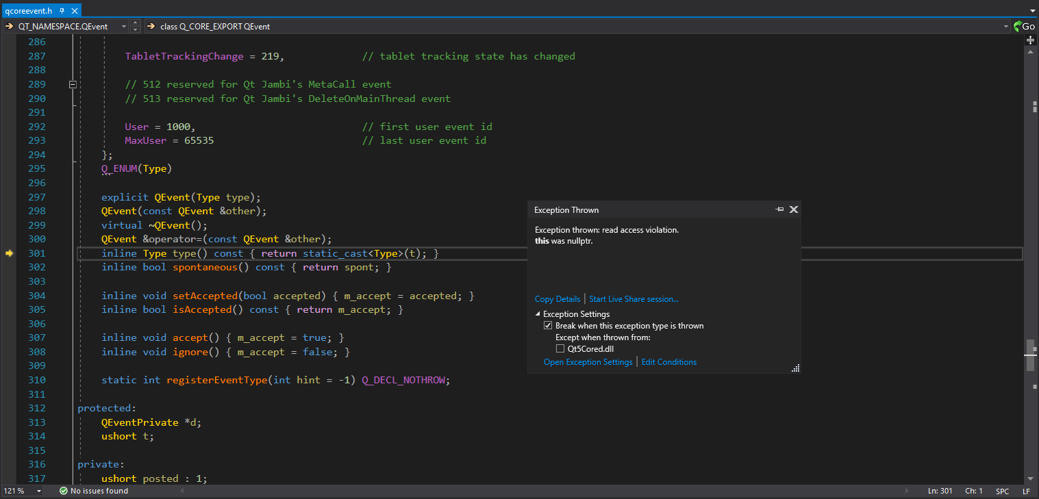 _Qt5Cored.dll!QEvent::type() Line 301 C++_ _Qt5Quickd.dll!QQuickPointerMouseEvent::isPressEvent() Line 1535 C++_ quick/items/qquickevents.cpp:1745 _Qt5Quickd.dll!QQuickWindowPrivate::sendFilteredPointerEventImpl(QQuickPointerEvent * event, QQuickItem * receiver, QQuickItem * filteringParent) Line 2906 C++_ _Qt5Quickd.dll!QQuickWindowPrivate::sendFilteredPointerEvent(QQuickPointerEvent * event, QQuickItem * receiver, QQuickItem * filteringParent) Line 2884 C++_ _Qt5Quickd.dll!QQuickWindowPrivate::deliverMouseEvent(QQuickPointerMouseEvent * pointerEvent) Line 1781 C++_ _Qt5Quickd.dll!QQuickWindowPrivate::deliverPointerEvent(QQuickPointerEvent * event) Line 2363 C++_ _Qt5Quickd.dll!QQuickWindowPrivate::handleMouseEvent(QMouseEvent * event) Line 2225 C++_ _Qt5Quickd.dll!QQuickWindow::mouseMoveEvent(QMouseEvent * event) Line 2163 C++_ _Qt5Guid.dll!QWindow::event(QEvent * ev) Line 2243 C++_ _Qt5Quickd.dll!QQuickWindow::event(QEvent * e) Line 1688 C++_ _Qt5Cored.dll!QCoreApplicationPrivate::notify_helper(QObject * receiver, QEvent * event) Line 1249 C++_ _Qt5Cored.dll!doNotify(QObject * receiver, QEvent * event) Line 1178 C++_ _Qt5Cored.dll!QCoreApplication::notify(QObject * receiver, QEvent * event) Line 1165 C++_ _Qt5Guid.dll!QGuiApplication::notify(QObject * object, QEvent * event) Line 1797 C++_ _Qt5Cored.dll!QCoreApplication::notifyInternal2(QObject * receiver, QEvent * event) Line 1088 C++_ _Qt5Cored.dll!QCoreApplication::sendSpontaneousEvent(QObject * receiver, QEvent * event) Line 1489 C++_ _Qt5Guid.dll!QGuiApplicationPrivate::processMouseEvent(QWindowSystemInterfacePrivate::MouseEvent * e) Line 2108 C++_ _Qt5Guid.dll!QGuiApplicationPrivate::processWindowSystemEvent(QWindowSystemInterfacePrivate::WindowSystemEvent * e) Line 1843 C++_ _Qt5Guid.dll!QWindowSystemInterface::sendWindowSystemEvents(QFlags<enum QEventLoop::ProcessEventsFlag> flags) Line 1157 C++_ _qwindowsd.dll!QWindowsGuiEventDispatcher::sendPostedEvents() Line 83 C++_ _Qt5Cored.dll!qt_internal_proc(HWND__ * hwnd, unsigned int message, unsigned __int64 wp, __int64 lp) Line 247 C++_ _[External Code]_ _Qt5Cored.dll!QEventDispatcherWin32::processEvents(QFlags<enum QEventLoop::ProcessEventsFlag> flags) Line 640 C++_ _qwindowsd.dll!QWindowsGuiEventDispatcher::processEvents(QFlags<enum QEventLoop::ProcessEventsFlag> flags) Line 74 C++_ _Qt5Cored.dll!QEventLoop::processEvents(QFlags<enum QEventLoop::ProcessEventsFlag> flags) Line 139 C++_ _Qt5Cored.dll!QEventLoop::exec(QFlags<enum QEventLoop::ProcessEventsFlag> flags) Line 225 C++_ _Qt5Cored.dll!QCoreApplication::exec() Line 1389 C++_ _Qt5Guid.dll!QGuiApplication::exec() Line 1785 C++_ _cvi42.exe!main(int argc, char * * argv) Line 74 C++_ _cvi42.exe!WinMain(HINSTANCE__ * __formal, HINSTANCE__ * __formal, char * __formal, int __formal) Line 97 C++_