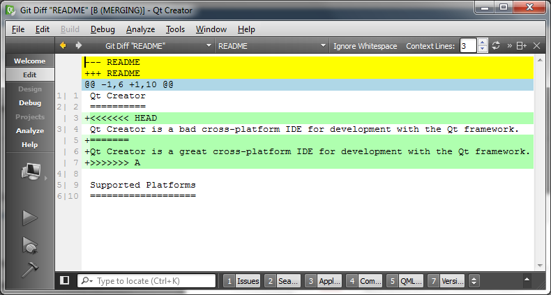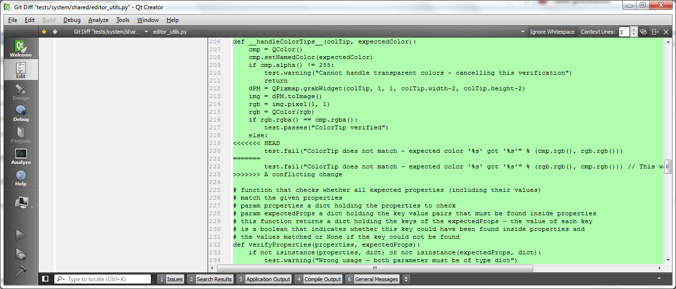 Instead, Creator could show the unchanged lines on both sides next to each other. The lines which have been changed from the parent revision of the checked out branch, i.e. everything between "<<<<" and ">>>>" could be shown and hightlighted in the right window.