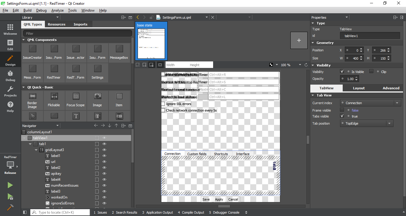The Qt Quick Designer does not correctly display the QML TabView (please refer to the attached screenshots). qmlscene displays the form correctly.