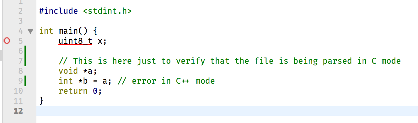 Types from <stdint.h> do not work in C mode. E.g., uint8_t is not recognized as a valid type (screenshot).