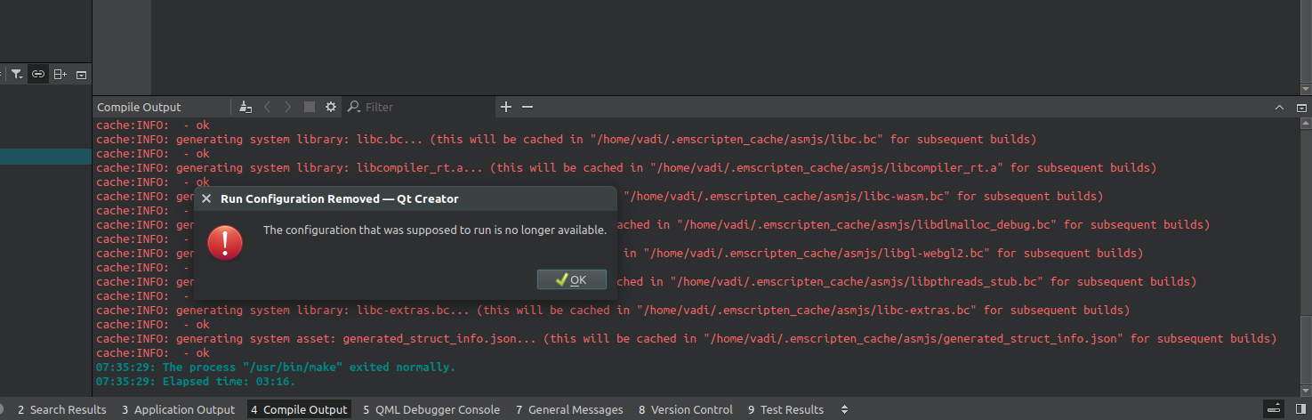 Compiling the simple calendarwidget example on webassembly with qt creator's webassembly support takes 28mins on my machine, because qt creator mostly sits and does this by default: https://imgur.com/a/dcEcv7s
