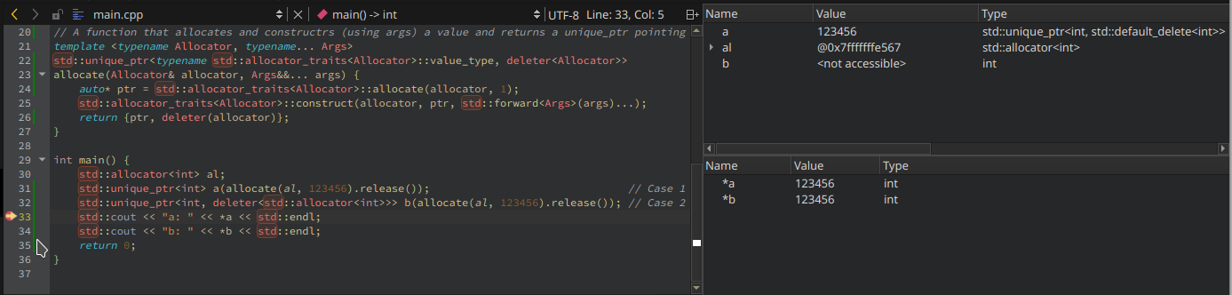 #include <iostream> #include <memory> // The most basic deleter template <typename Allocator> struct deleter { Allocator allocator; deleter() : allocator() { } deleter(Allocator& allocator) : allocator(allocator) { } void operator()(typename std::allocator_traits<Allocator>::value_type* ptr) { std::allocator_traits<Allocator>::destroy(allocator, ptr); std::allocator_traits<Allocator>::deallocate(allocator, ptr, 1); } }; // A function that allocates and constructrs (using args) a value and returns a unique_ptr pointing to template <typename Allocator, typename... Args> std::unique_ptr<typename std::allocator_traits<Allocator>::value_type, deleter<Allocator>> allocate(Allocator& allocator, Args&&... args) { auto* ptr = std::allocator_traits<Allocator>::allocate(allocator, 1); std::allocator_traits<Allocator>::construct(allocator, ptr, std::forward<Args>(args)...); return {ptr, deleter(allocator)}; } int main() { std::allocator<int> al; std::unique_ptr<int> a(allocate(al, 123456).release()); // Case 1 std::unique_ptr<int, deleter<std::allocator<int>>> b(allocate(al, 123456).release()); // Case 2 std::cout << "a: " << *a << std::endl; std::cout << "b: " << *b << std::endl; return 0; }