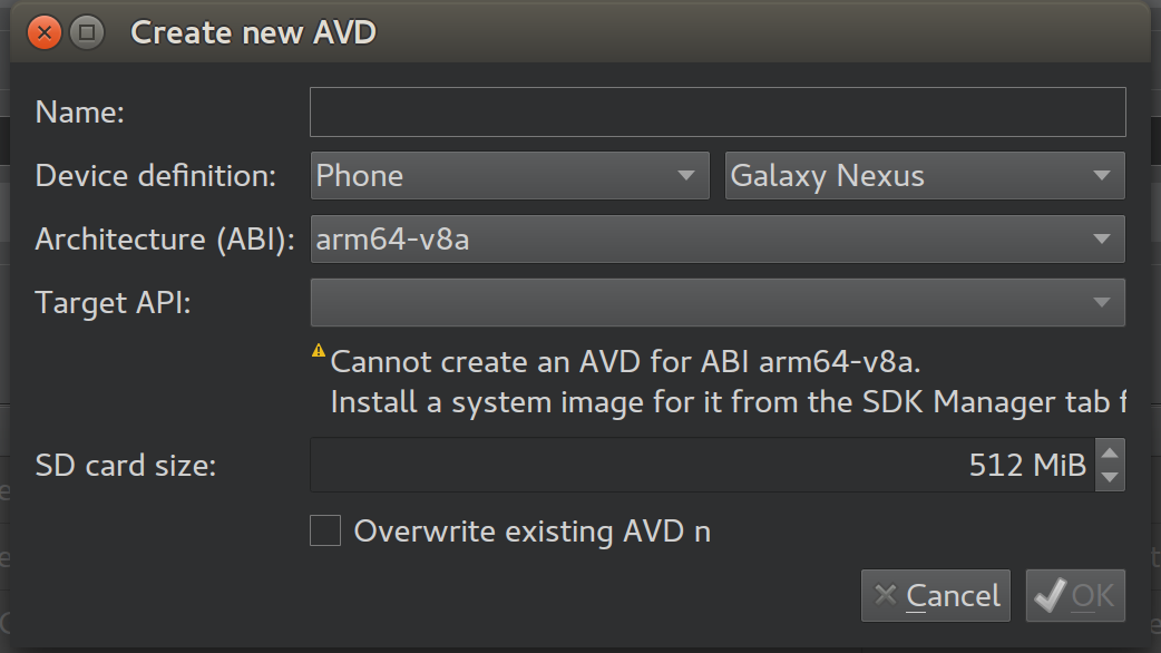 Error messages shown in AVD creation dialog are not wrapped and so they are cut off. Also the dialog seems to have maximum width set so it is impossible to see the full message.