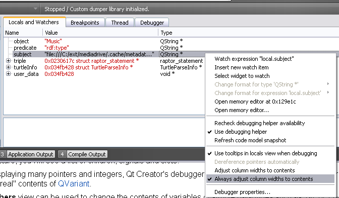 When debugging I'd like to see full contents of a QString variable. I did not find a way to resize the value column in Locals and Watchers.