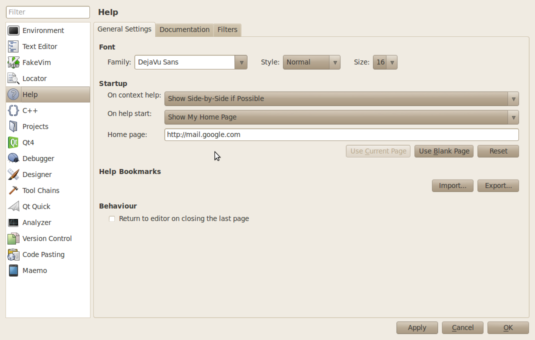 1.Run Qt Creator, set startup homepage of Help mode at "Options.. =>