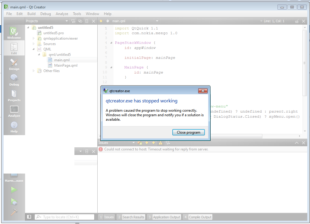 5. Qt Creator will crash. See attached picture for more information.