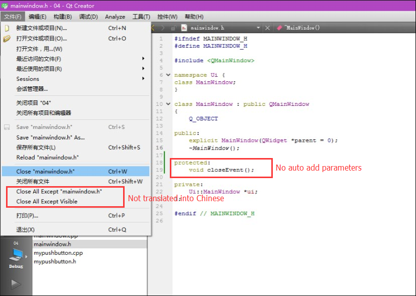 4)When I re implement an event, such as: closeEvent(), Qt does not automatically fill the parameters for this event.
