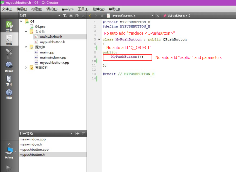 3)When I re implementation of a class, for example: to realize QPushButton, Qt does not automatically add "#include <QPushButton>","Q_OBJECT","explicit".